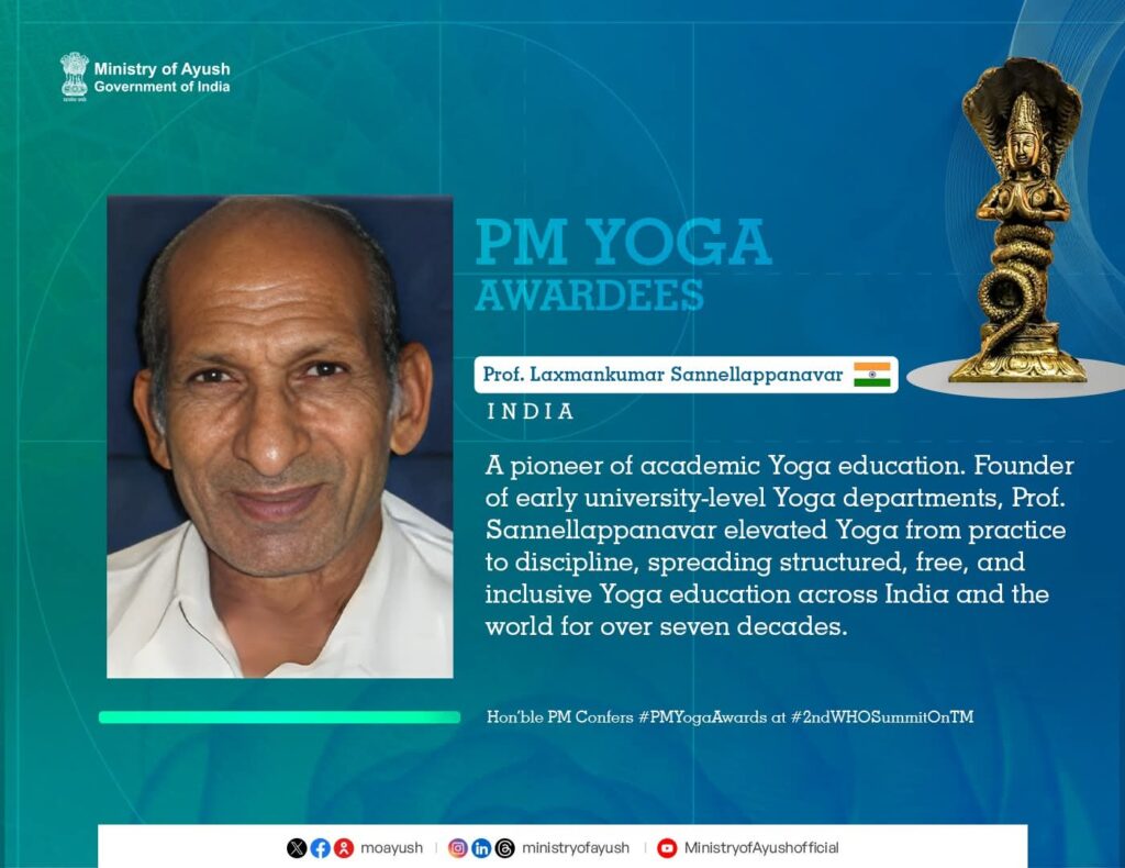 One man, one passion, one vision and mission of spreading awareness of Yoga. Started on foot in a remote village in Karnataka, India in 1949 and still going strong. Laxmankumar V Sannellappanavar (“Guruji”), Eighty five years now, is full of enthusiasm to provide FREE Yoga training to everyone, as he has done all his life.